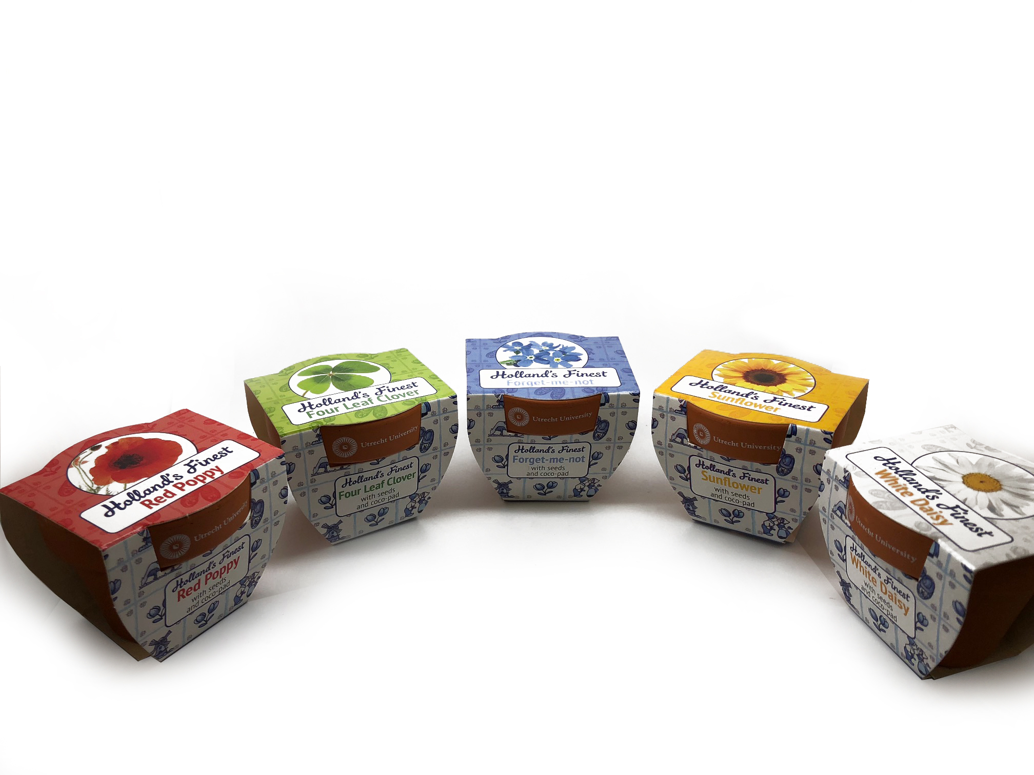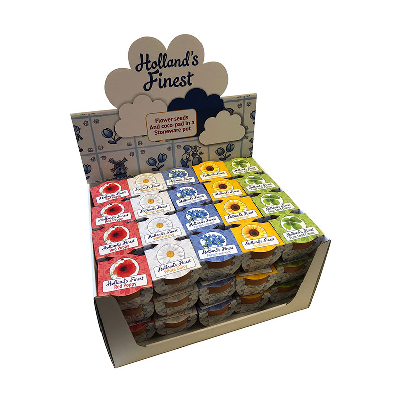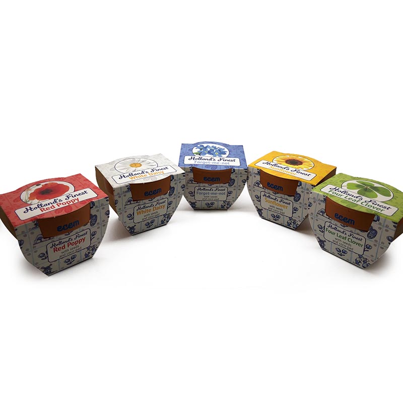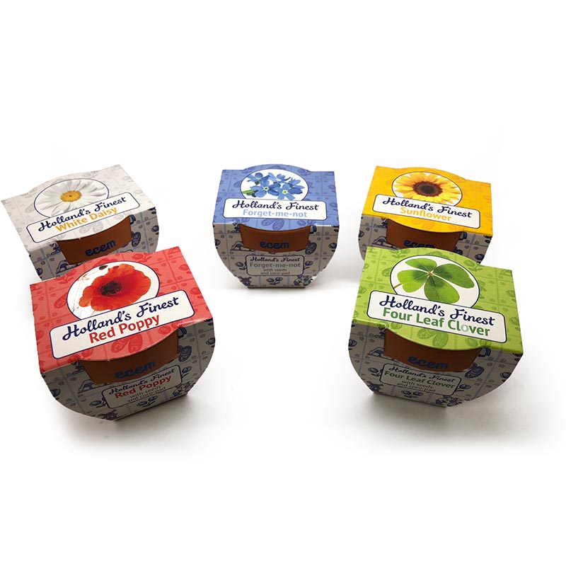 De bloempotjes zijn verkrijgbaar in de volgende varianten: Vergeet me nietjes, Klavertje vier, Rode Klaproos, Margrietjes, Zonnebloem of in een mix.
