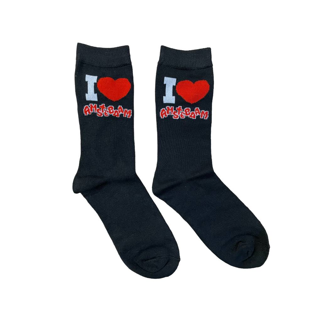 Een zwart paar sokken met de tekst I Love Amsterdam