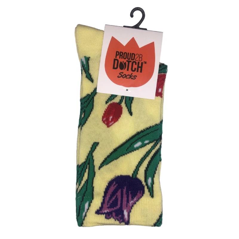 Ben je op zoek naar comfortabele en stijlvolle sokken? Dan zijn onze gele sokken met tulpen zeker iets voor jou! Deze sokken zijn niet alleen super comfortabel door het materiaal van 75% katoen, maar ook nog eens erg fashionable door de paarse en rode tulpen die erop gedrukt zijn. De gele kleur maakt de sokken bovendien leuk en opvallend, perfect voor een vrolijke dag.